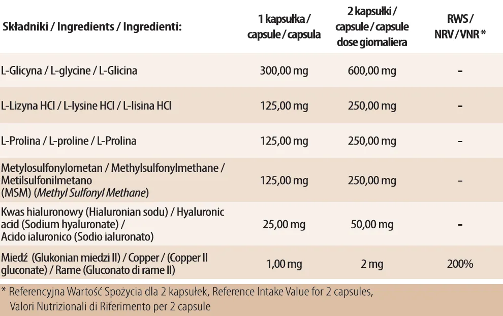 Zloženie: L-glycin, L-lysin, L-prolin, methylsulfonylmethan, hydroxypropylmethylcelulóza, kyselina hyaluronová (sodná soľ kyseliny hyaluronová), meď (glukonát medi II), protispekavá látka (soli mastných kyselín horčíka)